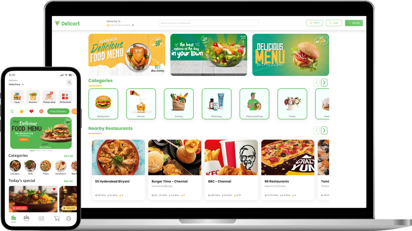 Deliware is a comprehensive, ready-to-launch food delivery script and mobile app solution designed to help businesses quickly start their online food delivery operations. The platform supports multiple devices, including iOS, Android, and desktop, with separate applications for customers, restaurant/store owners, delivery agents, and administrators.